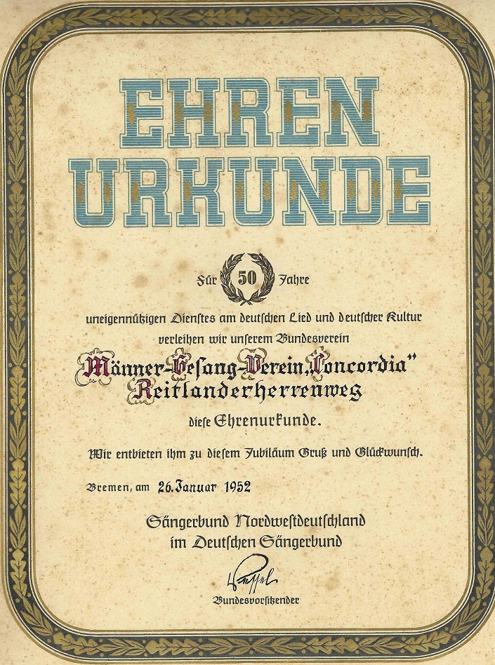 Diese Urkunde wurde zum 50 jährigem Bestehen des Gesangsverein im Jahre 1952 augehändigt: